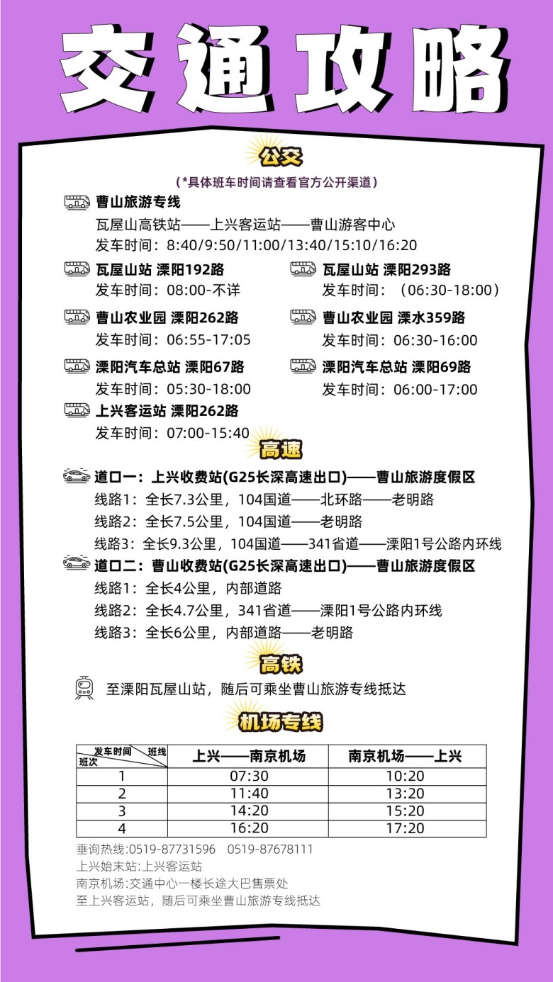 溧阳曹山旅游度假区位于溧阳市西北,与南京的高淳、溧水接壤,规划总面积 50.85 平方千米。其中,省级旅游度假区创建区面积9.02 平方千米,人口1.1万人。曹山旅游度假区入口处即有宁杭高铁瓦屋山站和宁杭高速上兴、…
